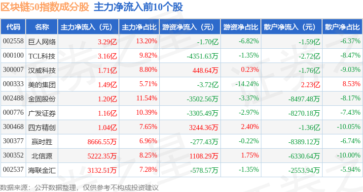 资金流向方面,区块链50(399286)指数成份股当日主力资金净流出合计39.56亿元,游资资金净流入合计8.66亿元,散户资金净流入合计30.89亿元。成份股资金流向详情见下表: