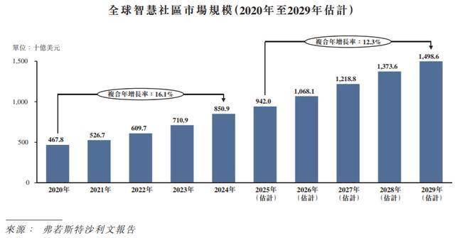 全球智慧社区市场已进入快速扩张阶段,市场规模从2020年的4,678亿美元增长至2024年的8,509亿美元,复合年增长率为16.1%。展望未来,在住宅智能化渗透率提升、跨场景联动深化及社区运营数字化升级等因素驱动下,预计2029年市场规模将增至14,986亿美元,复合年增长率为12.3%。