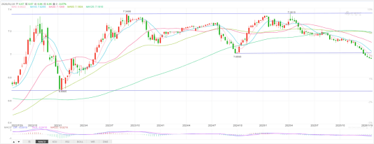 美元兑人民币周线图可见,此前2023年9月,2025年4月两次冲击7.35之后形成大型双顶形态并迎来下行走势,该形态关键颈线位于2024年9月低点7.0090,去年12月迎来破位走势后持续呈震荡下行,本周一亚洲市场最低跌至6.9625,人民币延续升值特征。后续美元兑人民币在没有极端事件影响下仍有望保持下跌趋势,而中短期再度回升至7.0090的概率较小,此轮下跌的中期目标位于2023年1月低点6.69附近。