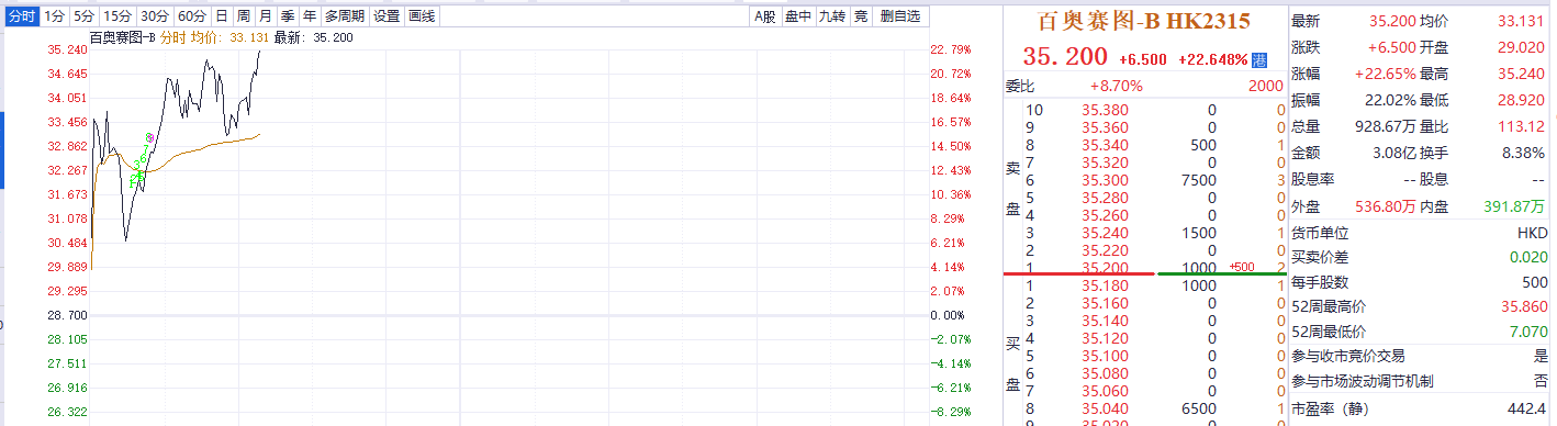 12月24日,百奥赛图-B早盘震荡向上,截至10时39分,股价上涨22.65%,现报35.2港元。深交所24日发布公告称,因百奥赛图-B在香港市场价格稳定期结束且相应A股上市满10个交易日,根据有关规定,港股通标的证券名单发生调整并自2025年12月24日起生效,调入百奥赛图。