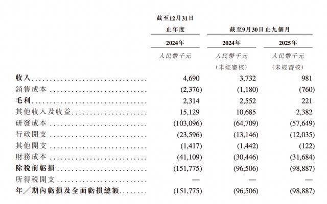于往绩记录期间,勤浩医药并无任何商业化产品。2024年、2025年前9月,公司收入分别为469万元、98.1万元,年╱期内亏损及全面亏损总额分别为1.52亿元、9888.7万元。