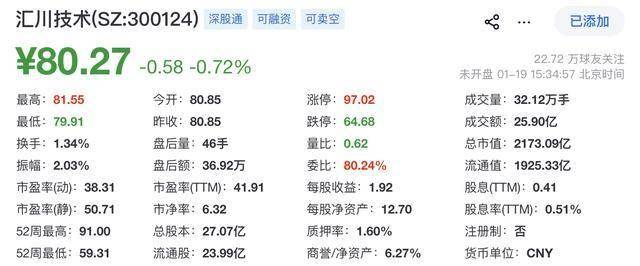 截至发稿时,汇川技术A股报80.27元,总市值约2173.09亿元。