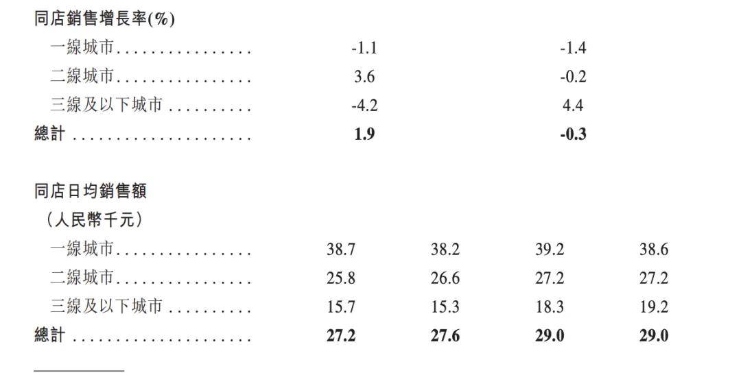 招股书显示,2024年及2025年前三季度,其一线城市门店的同店销售增长率已连续录得同比下滑,反倒是三线及以下城市保持正增长。