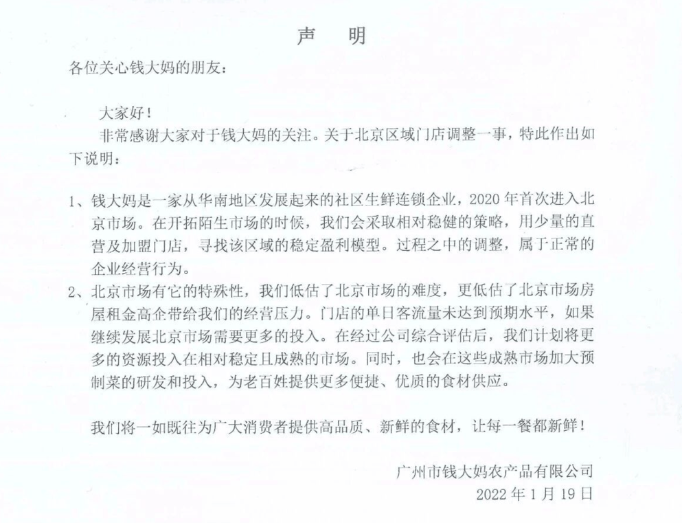 广东省市场饱和,而北京等市场的失败又直接击穿了钱大妈的单店盈利模型。