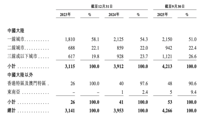 一线城市是品牌基本盘与高地:截至2025年9月30日,一线门店2150家,占比51%,地位稳固。下沉市场成新增长引擎:三线及以下城市门店占比从2023年的19.8%升至2025年9月的26.6%,净增门店数量显著,增速领先。