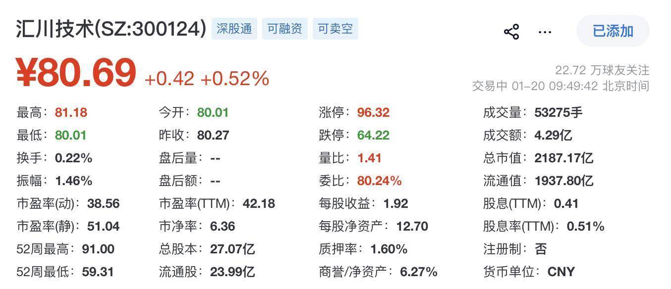 截至发稿时,汇川技术A股报80.69元,总市值约2187.17亿元。