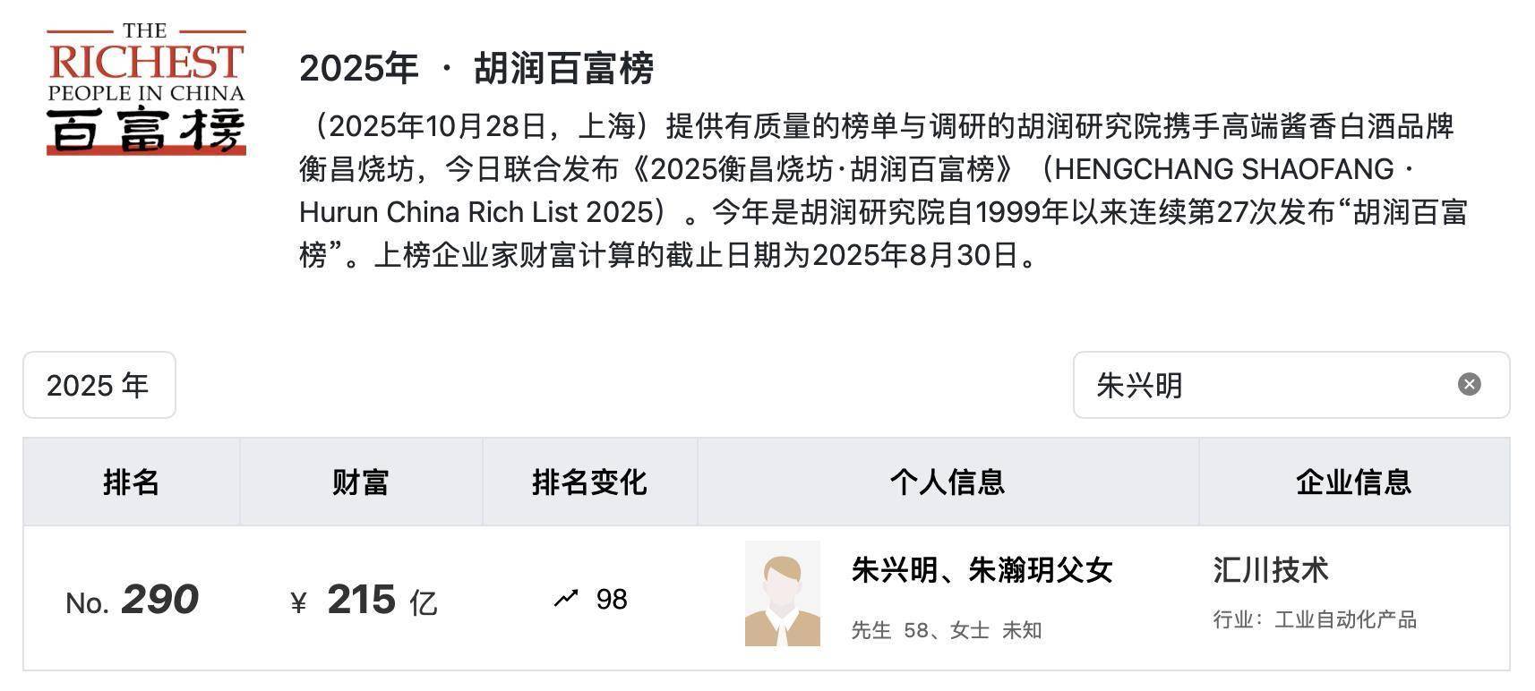 据《2025年胡润百富榜》,朱兴明、朱瀚玥父女身价215亿,排在第290名。
