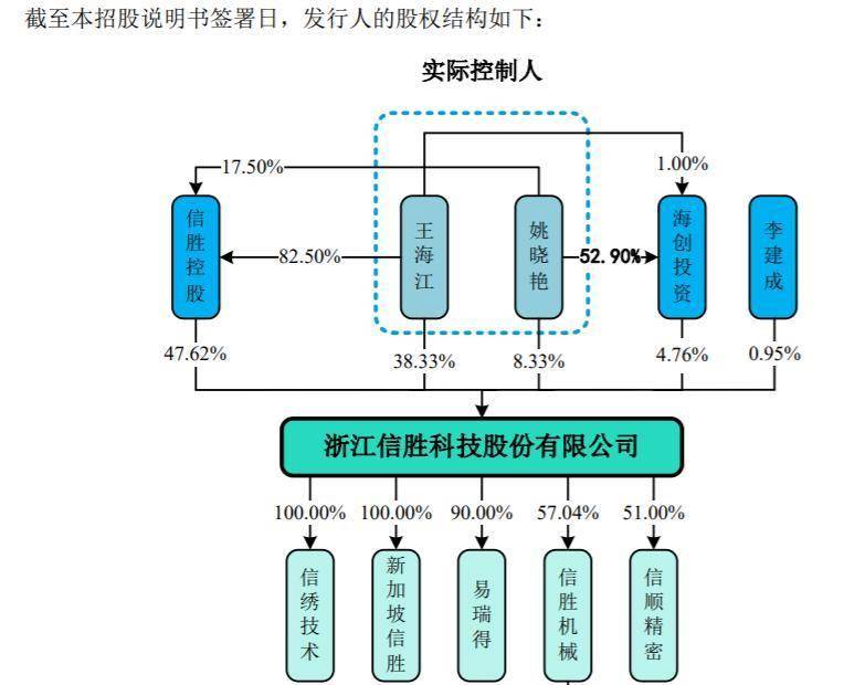 王海江及姚晓艳夫妇直接持有公司股份的比例为46.67%,通过信胜控股和海创投资控制公司的股份比例为52.38%,合计控制公司99.05%的股份对应的表决权,系公司实际控制人。