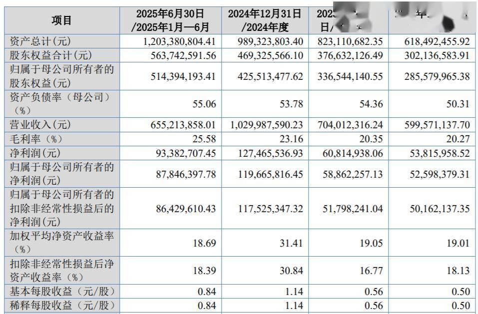 业绩方面,2022年至2024年及2025年上半年,公司营业收入分别为6.00亿元、7.04亿元、10.30亿元及6.55亿元;归属于母公司所有者的净利润分别为5259.84万元、5886.23万元、1.20亿元及8784.64万元。