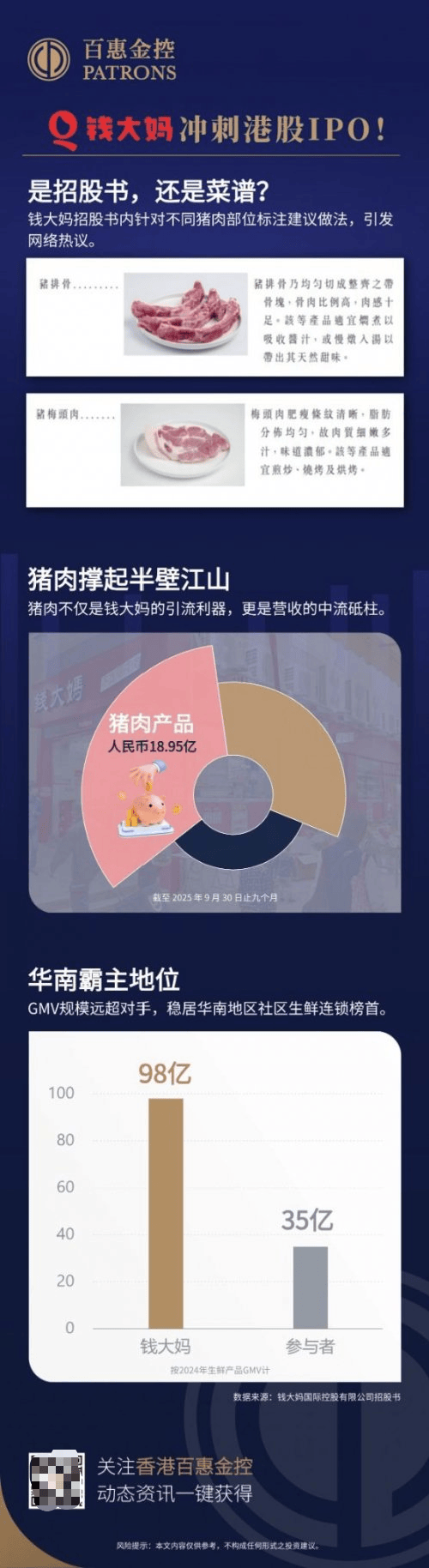 比如在介绍猪排骨时,招股书写到“适宜焖煮以吸收酱汁,或慢炖入以带出其天然甜味”;提及猪梅头肉时,建议“适宜煎炒、烧烤及烘烤”。网民笑言钱大妈这份招股书很实用,既能查阅业务数据,又能顺便学习家常菜谱。