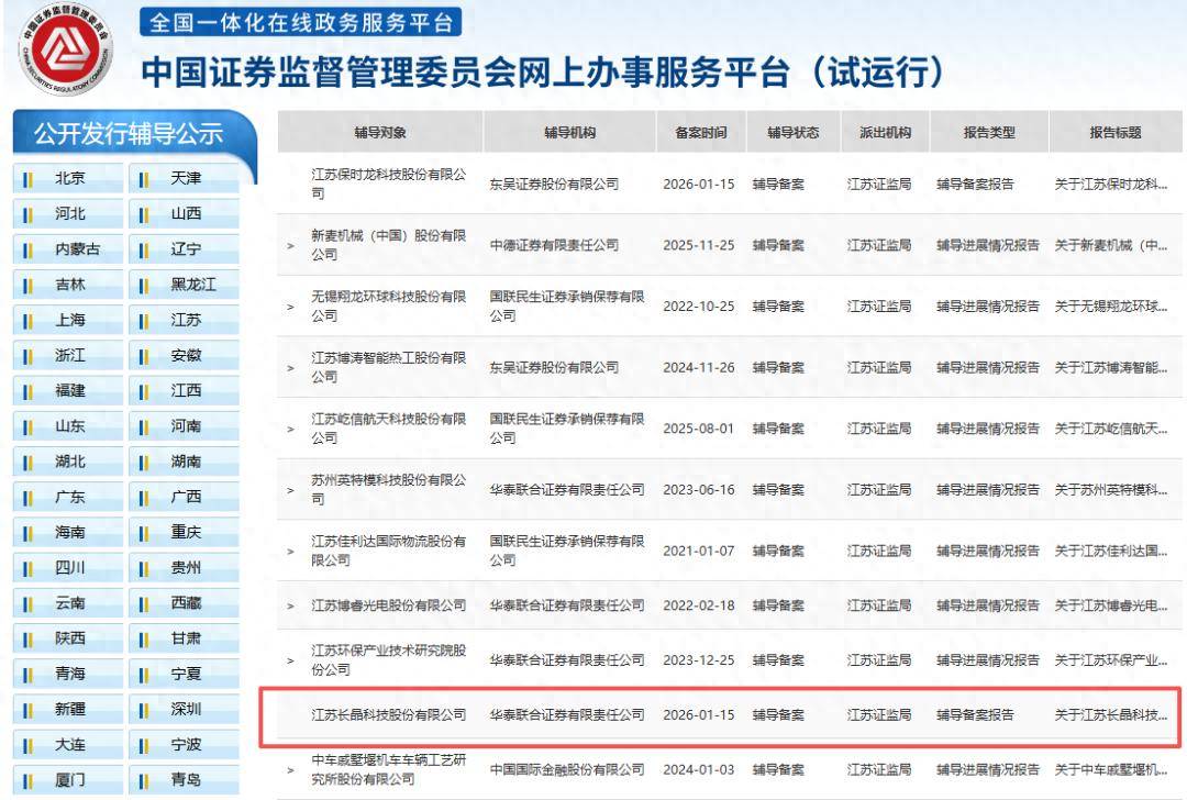 中国证监会官网披露信息显示,国家工信部认定的专精特新“小巨人”企业江苏长晶科技股份有限公司, 于2026年1月15日在江苏证监局完成IPO辅导备案登记,辅导机构为华泰联合证券。