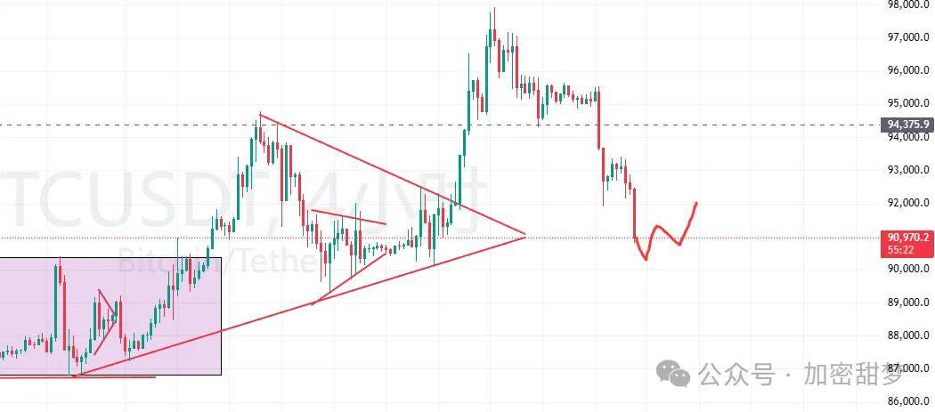 下方9w附近支撑依然属于强支撑位置,大概率触及后会出现止跌信号,所以我准备在9w附近分批挂单,89800加仓,89500加仓,这种加速下跌止跌后很容易出现收针反弹,低点预判对了至少一波不错的利润,可能会直接反抽到92500附近。