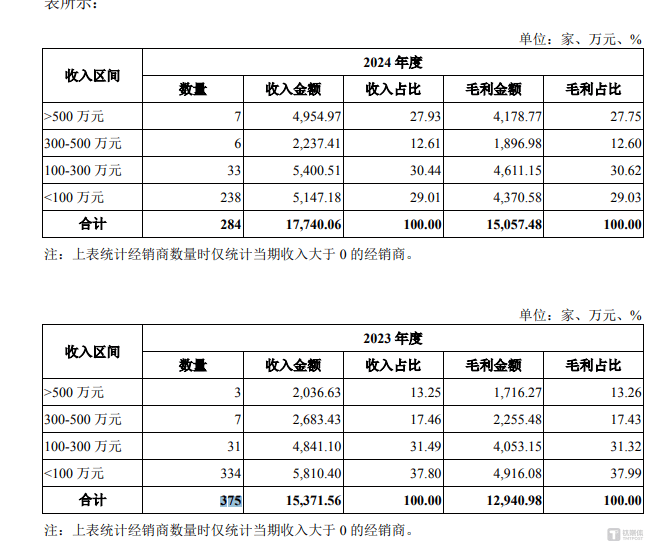 更为值得关注的是,公司经销商群体存在大规模变动的情况,2022年-2024年,新增经销商数量分别为126家、121家、103家,而退出经销商数量则达到156家、127家、194家,退出占比分别为40.94%、33.87%、68.31%,且退出数量始终多于新增数量,导致公司经销商总数从381家持续下滑至284家。这种高频次、大规模的经销商变动,引发了市场对其经销渠道稳定性的担忧,担心可能影响区域市场覆盖、终端维护以及产品销售的连续性等。