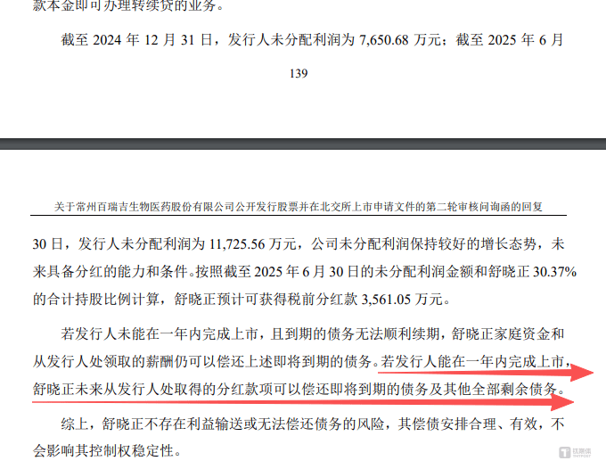 对此百瑞吉在问询函中表示,若公司未能在一年内完成上市且到期债务无法顺利续期,舒晓正可通过家庭资金及从公司领取的薪酬偿还即将到期债务;若公司顺利实现年内上市,舒晓正未来从公司取得的分红款项,即可覆盖即将到期债务及全部剩余债务。
