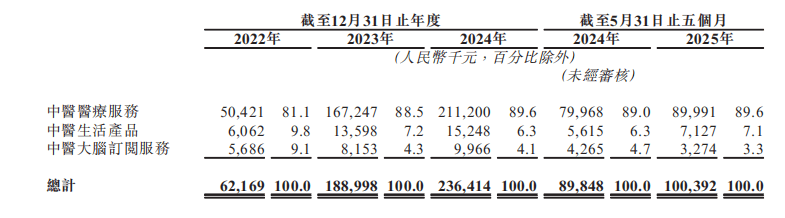 其中,问止中医的主要营收来自中医医疗服务,该业务包括预诊准备、人工智能辅助临床问诊、中医处方、开药及煎药服务。2022年至2024年该板块业务营收占比连续3年超过80%,2025年前五个月这一占比增加到89.6%,接近90%。
