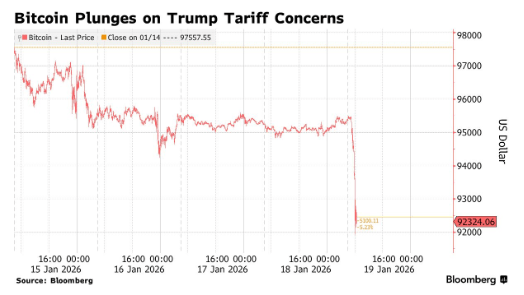 智通财经APP获悉,在美国总统特朗普宣布拟对八个欧洲国家加征新关税后,避险需求升温令风险资产普遍承压,加密货币市场随之遭遇重挫。