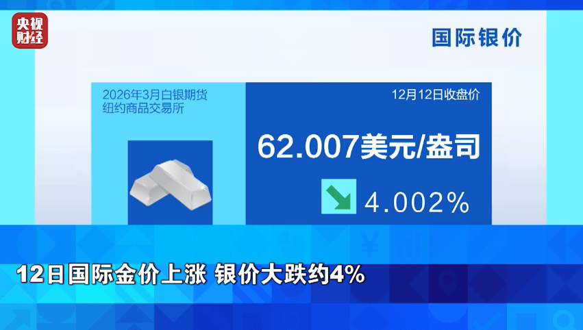 据央视财经,贵金属市场上,周五,市场押注美联储明年将继续实施宽松货币政策,美元指数跌至近两个月低点,利好黄金价格。此外,美国和委内瑞拉紧张局势升级,也同时推高了市场的避险情绪, 国际金价在每盎司4300美元上方继续冲高。截至收盘,纽商所交投最活跃的明年2月黄金期价上涨0.35%。部分投资者在国际银价在攀升至纪录新高后获利了结,令银价承压下跌。纽商所交投最活跃的明年3月白银期价收盘下跌约4%。从周线上看,受美元走软,需求强劲等因素影响,黄金期货主力合约价格累计上涨约2%,白银期货主力合约价格累计上涨5%。