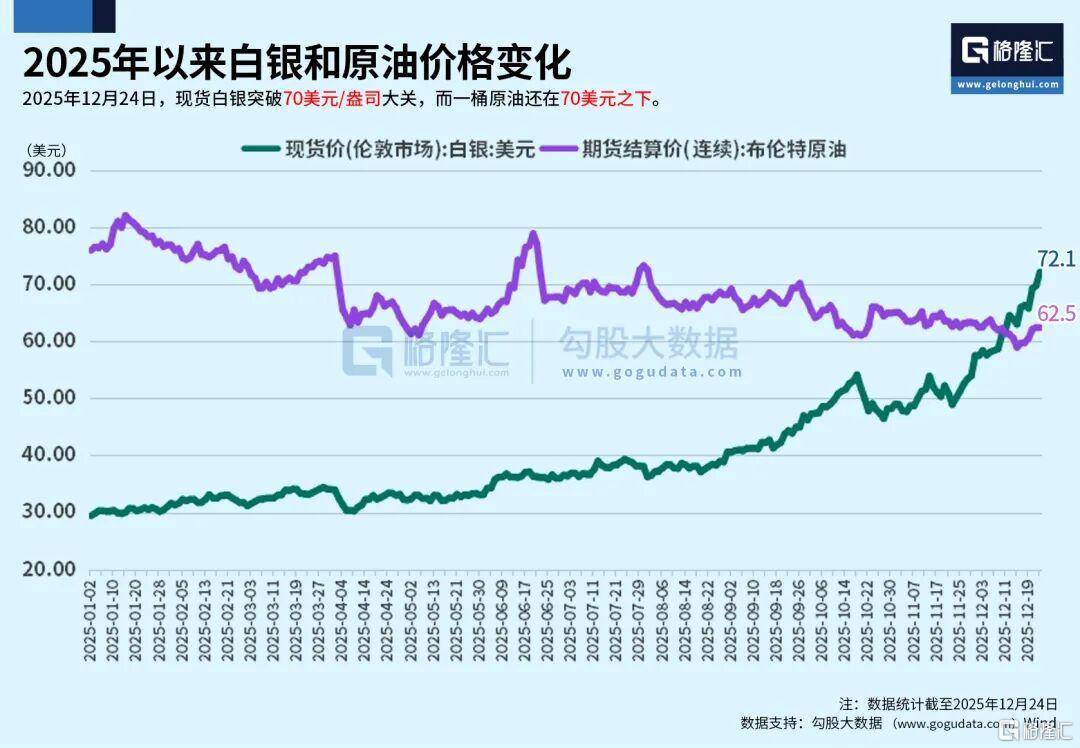 现货白银,历史性站上70美元一盎司,而一桶原油还在70美元之下。