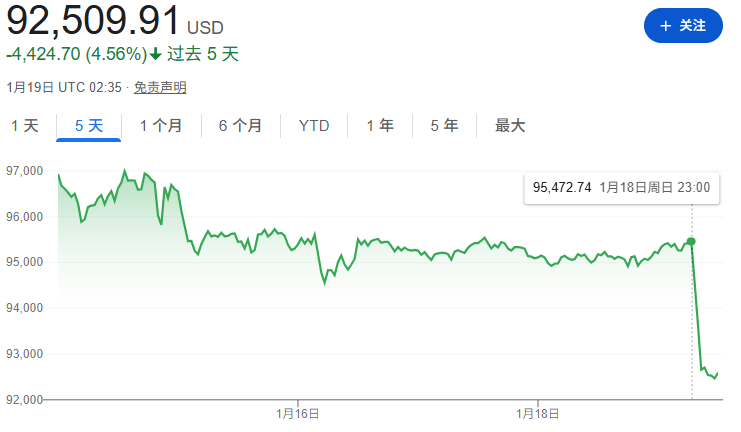 作为风险资产的加密市场也因此遭遇抛售,上周日(1月18日)晚间,比特币价格一度下跌3%,其他加密货币也纷纷下跌,凸显出市场的消极情绪。