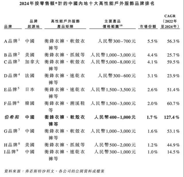 根据招股书中的数据,始祖鸟在2024年中国市场高性能户外服饰品牌中排名第三,伯希和排名第七。