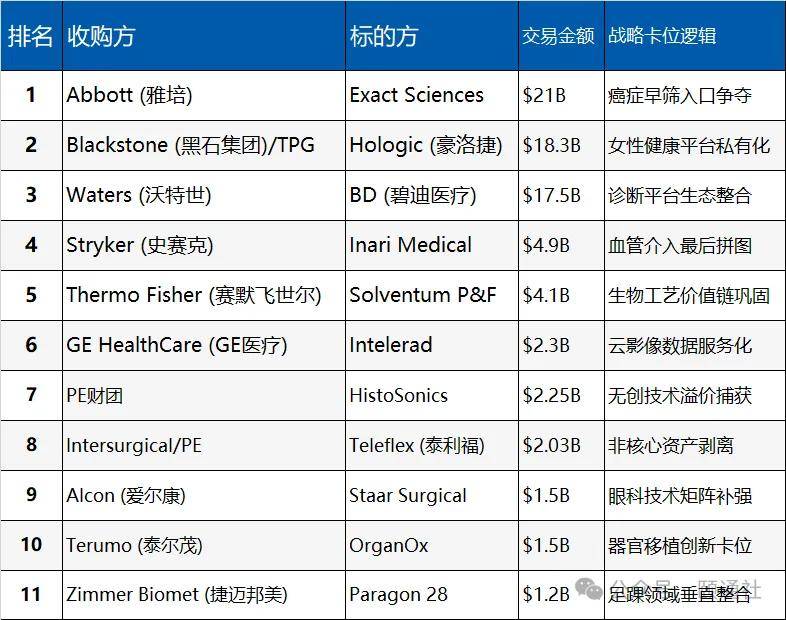 雅培需要癌症早筛弥补诊断管线,史赛克需要VTE切入血管介入增长赛道,GE医疗则需要云影像应对数字化竞争。每笔交易都有清晰的协同效应计算。