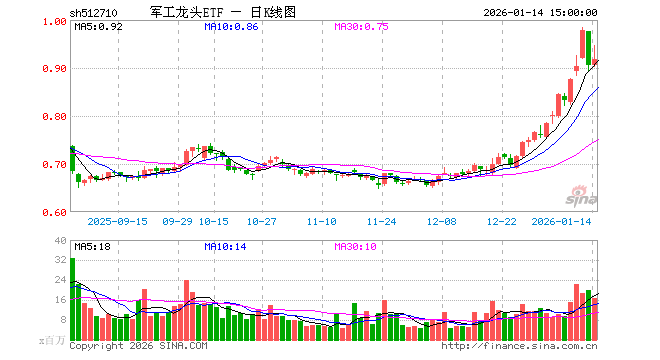 1月14日,军工龙头ETF(512710)涨1.21%,成交额15.57亿元。当日份额减少7.05亿份,最新份额为117.74亿份,近20个交易日份额减少68.50亿份。最新资产净值计算值为108.12亿元。