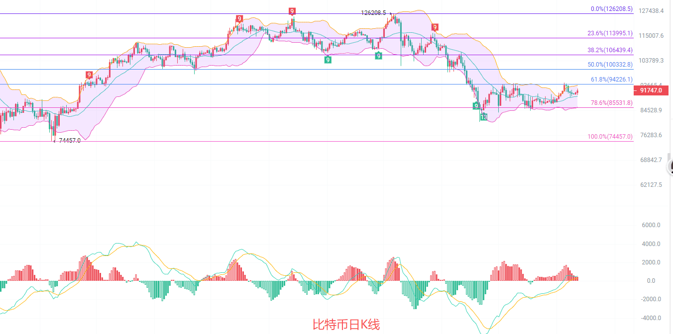 日K线发稿前最高92500,最低9万,EMA60阻力位明显在92500一线,短线阻力有效,中线阻力位关注黄金分割线0.618一带94200,MACD连续放量还没结束,DIF和DEA依旧在0轴线上方,布林带中规支撑9万关口,上轨关注94000,所以短线北上有效可以持有