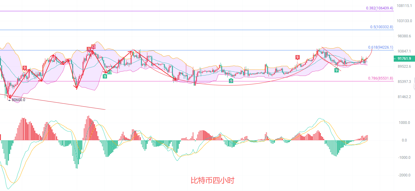 四小时K线正在进行U形过度,EMA趋势指标开始走强,MACD连续放量上行,梯量模式,DIF和DEA在冲击0轴线,布林带上轨91900大概率失守,布林带向上开口扩散,整体趋势上向北不变,继续上看,已经入场的币友恭喜了,没有入场的币友等回踩,