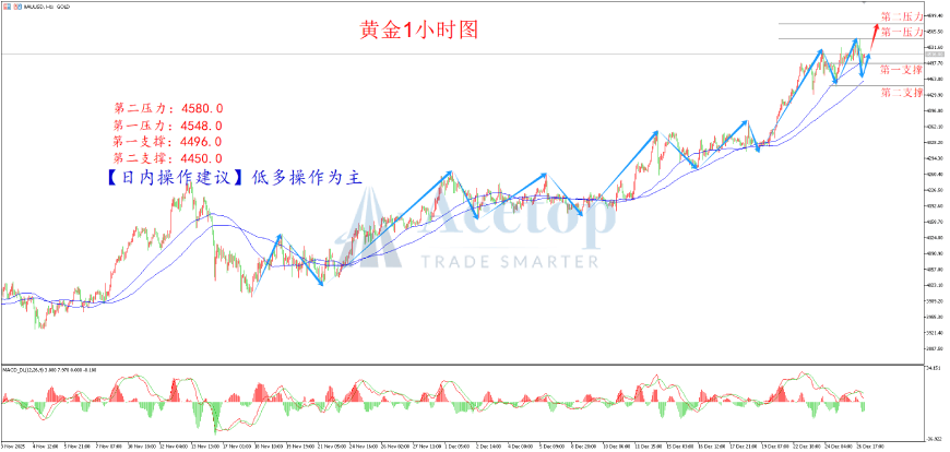 从上图黄金1小时图来看,上个交易日金价再涨创出近期高点,达到4548.0一线,整体的交易重心延续上行。均线系统上,价格高于60及100均线,且均线处于发散向上状态,表明黄金处于多头走势中。日内操作上依托下方支撑线,尝试逢低做多的操作思路,关注支撑位4496.0附近,可考虑企稳布局多单,上行关注前压力位4548.0一线,若上破,多头将进一步测试高点4580.0附近。