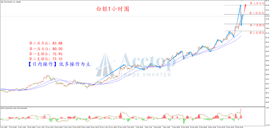 多单:建议75.95附近尝试做多,止损74.95,目标78.00、80.00附近。