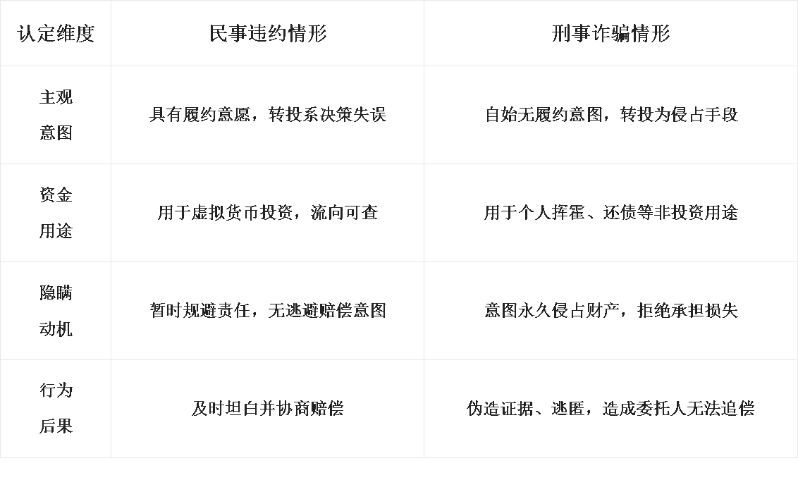 在虚拟货币“民刑交织”的纠纷中,法律既不纵容受托人的恶意欺诈,也不将正常投资风险归咎于刑事犯罪。唯有结合资金流向、行为动机、事后态度等全案证据,才能精准划定责任边界,实现法律评价的公平公正。