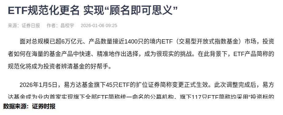 最近刷基金APP时发现,不少ETF的名字悄悄变了——比如易方达的港股行业ETF加了“港股通”,华泰柏瑞的指数ETF补了“华泰柏瑞”字样。一问才知道,这不是基金公司随便改的,是交易所的要求:从2026年3月底前,所有ETF的简称必须包含“投资标的+管理人+ETF”,比如“XX港股通ETF易方达”,目的就是让我们选ETF时,不用翻半天详情页,一眼就知道“买的是什么、谁在管”。