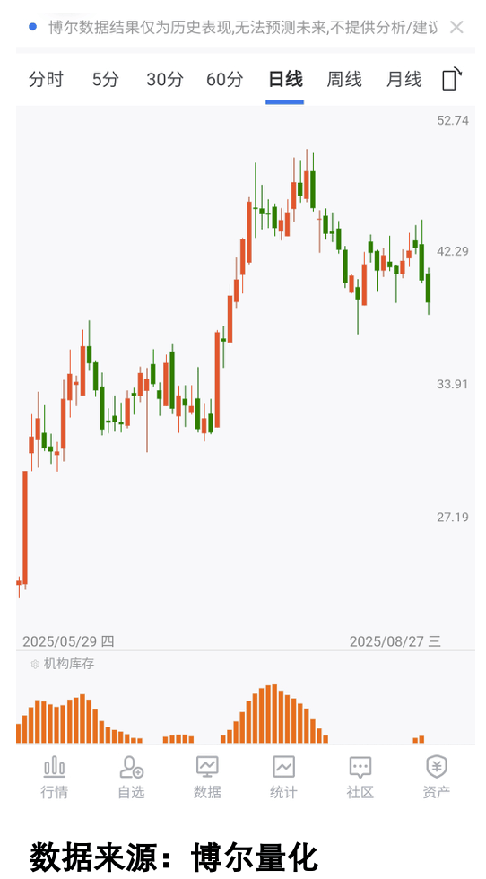 用量化数据一看就明白:这只股7月后的“机构库存”数据几乎消失了——所谓“机构库存”,是反映机构大资金交易活跃程度的数据,不是看“有没有持仓”,而是看“现在有没有积极买卖”。这只股虽然被重仓,但机构7月后没怎么交易,股价自然撑不住。就像你买了一堆零食但放在柜子里不吃,零食不会自己变好吃,股票也不会自己涨。