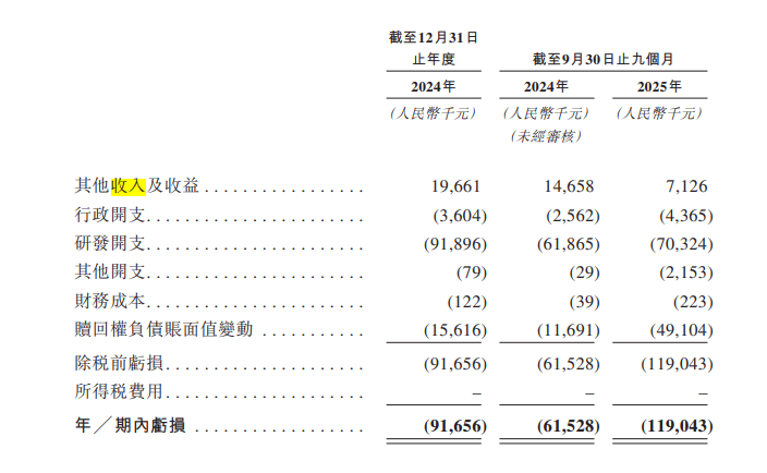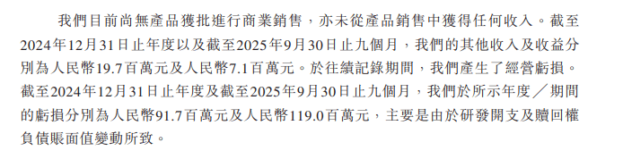 财务数据显示,2024年度公司净亏损9165.6万元,2025年前三季度净亏损进一步扩大至1.19亿元,主要由于研发开支及赎回权负债账面值变动所致。现金流方面,经营活动现金净流出持续扩大,2024年为7886.5万元,2025年前三季度增至8407.5万元,资金主要用于研发及行政活动。