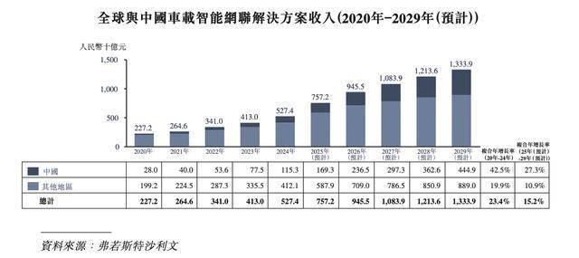 车载智能网联解决方案通常由硬件、软件及服务三部分构成。硬件层面主要包含通讯模组、车载联网控制单元及其他硬件设备,软件层面则涵盖车载网络平台及其他有关服务。随着智能网联汽车产量持续增长,全球及中国车载智能网联解决方案的市场规模正不断扩大,预计将由2024年的5,274亿元及1,153亿元增长至2029年的13,339亿元及4,449亿元。