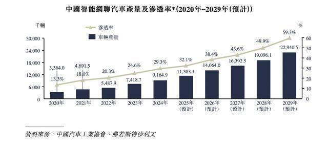 自2020年至2024年,中国智能网联汽车产量稳步攀升,这主要得益于三大相互促进的因素共同作用:政策引导、市场需求与技术进步。政府已推出一系列战略规划,积极推动智能汽车发展,为行业发展提供了明确方向与强劲支持,进而吸引众多企业投入研发与制造领域。与此同时,消费者对智能与网联汽车功能的接受度稳步提升,促使整车制造商加速推出相关车型。此外,国内在汽车芯片、传感器及运作系统等关键技术领域取得突破,有效降低汽车成本并提升产品可靠性,确保了大规模生产的可行性。该等因素的综合效应促使中国智能网联汽车产量持续扩张,于2024年达9,164.9千辆,占全国汽车总产量的32.1%。
