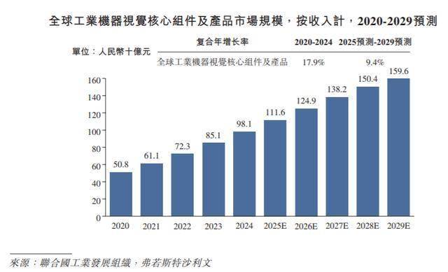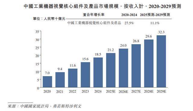 近年来,在工业数智化转型推进和智能工业设备应用日益广泛的推动下,工业机器视觉核心组件及产品的全球和中国市场规模均稳步增长,2020年至2024年的复合年增长率分别为17.9%和27.5%。2024年,按收入计,工业机器视觉核心组件及产品的全球和中国市场规模分别为人民币981亿元和人民币185亿元。展望未来,随著对基于成像的自动定位、识别、测量及检测的需求日益增长,且要求更加精确和智能化,预计工业机器视觉核心组件及产品的全球市场规模将保持稳定增长势头,预期于2029年收入将达到人民币1,596亿元;2025年至2029年的预计复合年增长率将达到9.4%。相比之下,在新能源、电子制造、PCB和半导体等下游行业对智能检验和分析需求日益增长的推动下,工业机器视觉核心组件及产品的中国市场规模预计于2029年收入将达到人民币323亿元,2025年至2029年的预计复合年增长率达到11.1%。