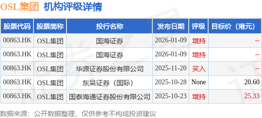 截至2026年1月20日收盘,OSL集团(00863.HK)报收于17.0港元,下跌7.15%,成交量291.05万股,成交额5038.43万港元。投行对该股的评级以增持为主,近90天内共有3家投行给出增持评级,近90天的目标均价为22.96港元。国海证券最新一份研报给予OSL集团增持评级。