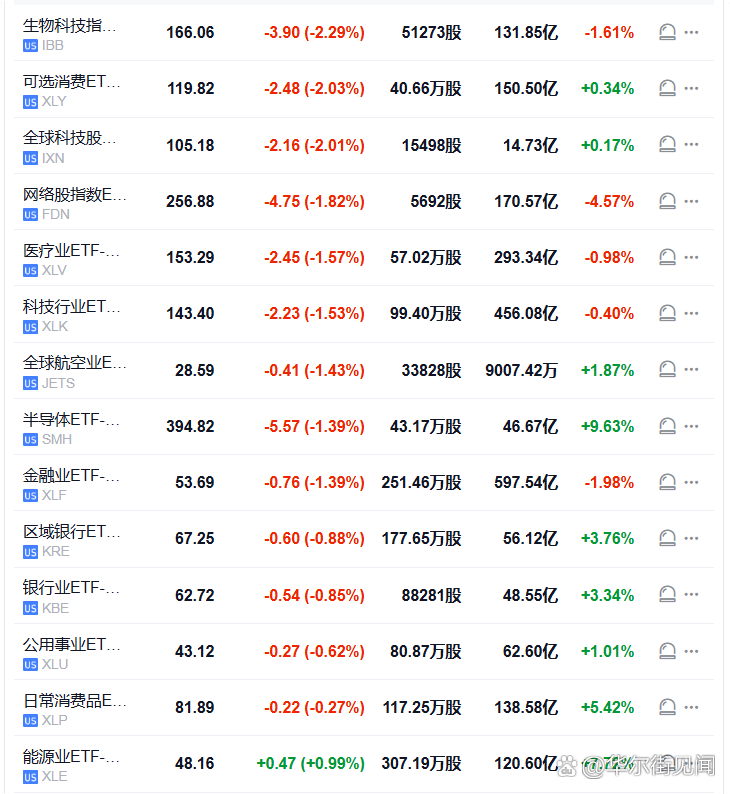 行业ETF美股盘初几乎全线溃败,生物科技指数ETF、可选消费ETF、全球科技股指数ETF至多跌2.29%,网络股指数ETF、科技行业ETF、半导体ETF至多跌1.82%,能源业ETF涨0.55%。