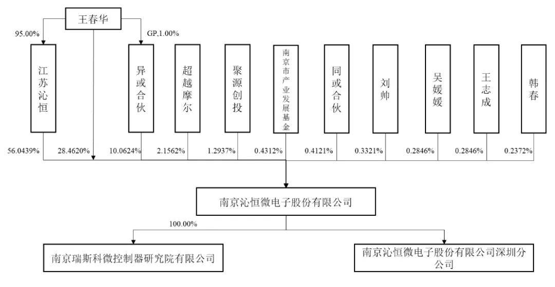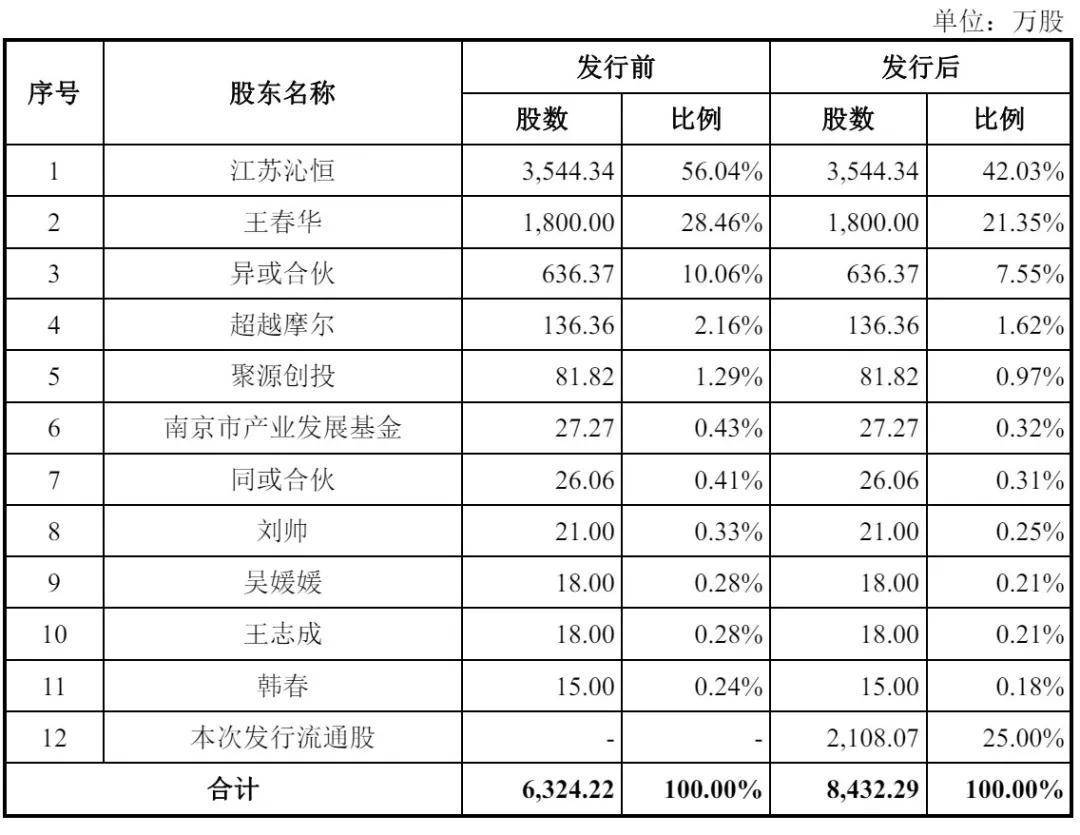 IPO后,江苏沁恒持股42.03%,王春华持股为21.35%,异或合伙持股为7.55%,超越摩尔持股为1.62%,聚源创投持股为0.97%,南京市产业发展基金持股为0.32%,同或合伙持股为0.31%,刘帅持股为0.25%,吴媛媛、王志成分别持股为0.21%,韩春持股为0.18%。