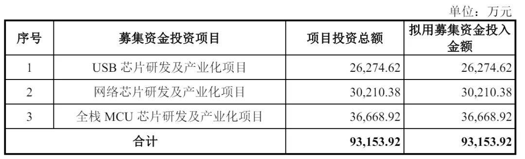 沁恒微原计划募资9.32亿元,其中,2.6亿元用于USB 芯片研发及产业化项目,3亿元用于网络芯片研发及产业化项目,3.67亿元用于全栈 MCU 芯片研发及产业化项目。