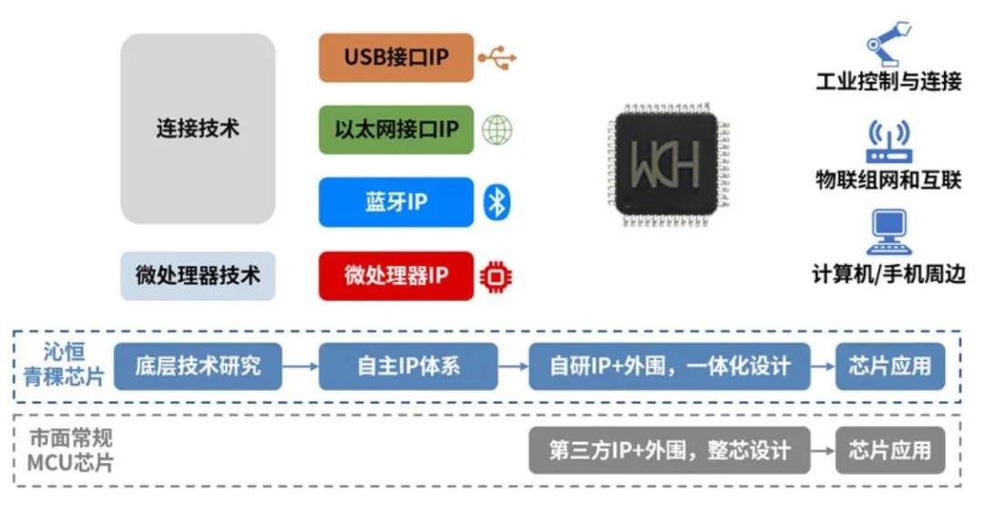 沁恒微专注于连接技术和微处理器(简称“处理器”或“内核”)研究,是一家基于自研专业接口 IP、内核 IP 构建一体化芯片的集成电路设计企业。报告期内,公司主营业务为接口芯片和互连型 MCU 芯片研发、设计与销售。