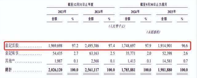 2025年前三季度,袁记云饺品牌贡献96.6%的收入,袁记味享预包装业务仅占2.6%,虽同比增长46%,但对整体营收支撑有限。