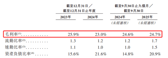 招股书显示,2023年至2024年,公司毛利率从25.9%降至23%,2025年前三季度虽回升至24.7%,但整体呈波动下降趋势。