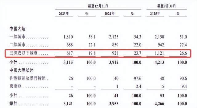 而三线及以下城市门店数占比虽从19.8%升至26.6%,但低线市场渗透仍不足,面临消费习惯适配、供应链覆盖等多重挑战。