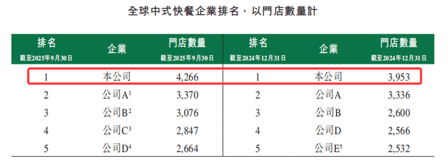 截至2025年9月30日及2024年12月31日,按门店数量计,袁记均为中国及全球最大中式快餐企业,门店数分别达4266家、3953家。