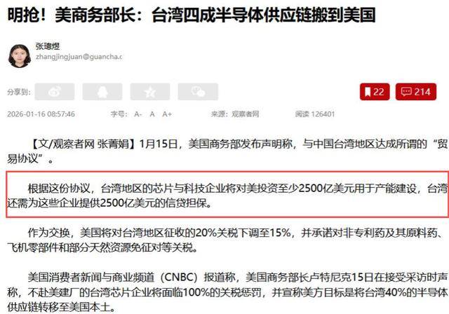 这五千亿美元的投资要求,本质上就是要掏空台岛地区的高科技产业根基,让其彻底失去产业自主发展的能力。