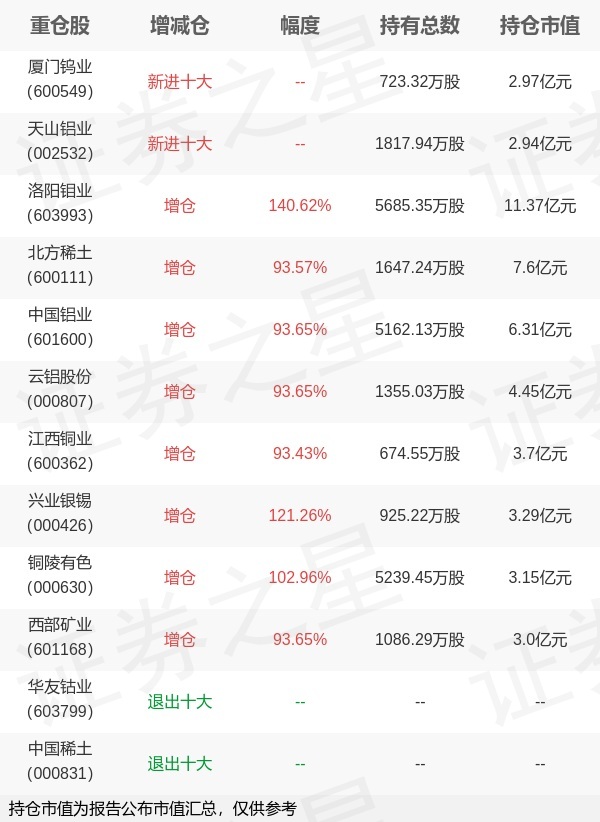 证券之星消息,1月21日万家基金旗下贺方舟管理的万家中证工业有色金属主题交易型开放式指数基金公布年报,近1年净值增长率116.52%。与上一季度相比,该基金前十大重仓股新增厦门钨业,天山铝业;并对洛阳钼业增仓3322.51万股,为该基金第一大重仓股;华友钴业,中国稀土等退出前十大重仓股;详细数据如下:
