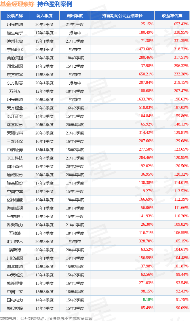 蔡铮管理的交银国证新能源指数(LOF)A基金在20年2季度买入阳光电源,在持有3个季度后在21年1季度卖出。持有期间的估算收益率为657.43%,持有期间阳光电源在2020年到2021年的年报营业总收入增幅达25.15%。