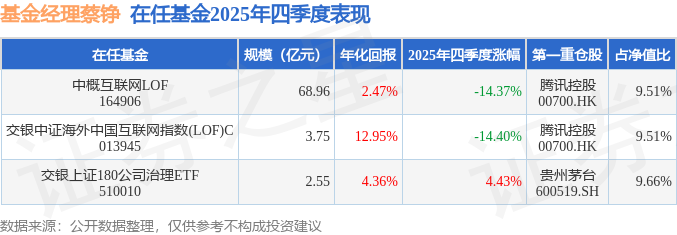 证券之星消息,截止2025年四季度末,基金经理蔡铮旗下共管理3只基金,本季度表现最佳的为交银上证180公司治理ETF(510010),季度净值涨4.43%。